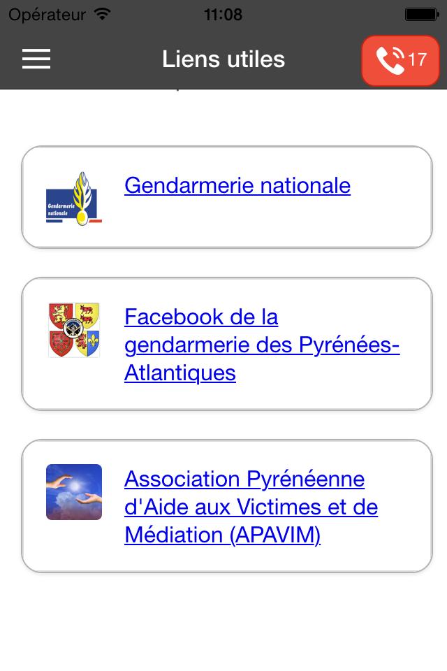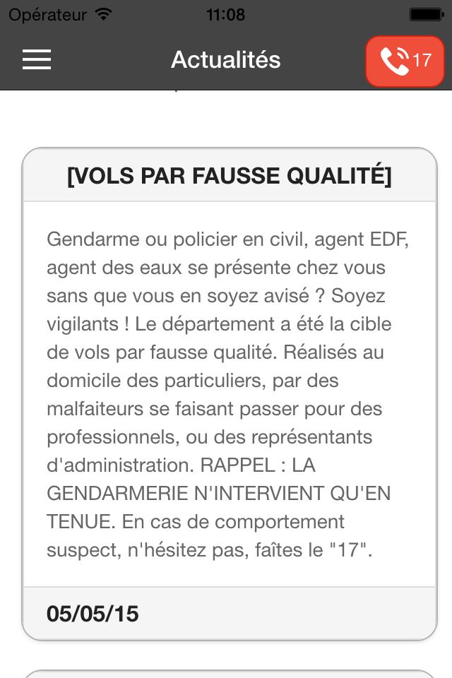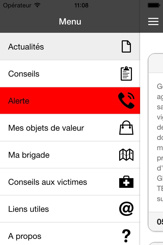 - Attentive close close to (alerts): allows you to transmit to the gendarmerie a photograph of a suspicious fact observed by the user. This action must be supplemented by a telephone call to be valid;